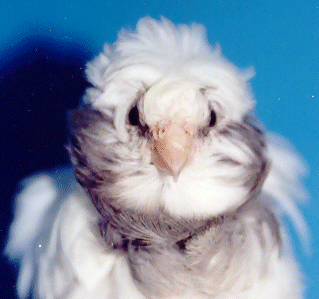 Bei der Brustfrisur streben die Federn symmetrisch von beiden Körperseiten der Brustmitte aufeinander zu und berühren sich dort. Der Bauch ist frisiert.