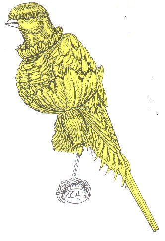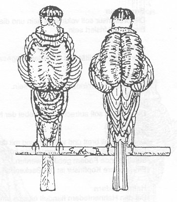 Auf den technischen Zeichnungen, ist deutlich zu erkennen, worauf es beim Paduaner ankommt. Lange, breite und gut entwickelte Stützfedern, die beidseitig über den befiederten Schenkeln aufwärts streben, einen Mantel, der einen möglichst langen und geraden Scheitel besitzt und damit die Frisur in zwei gleiche möglichst symmetrische Teile aufgliedert. Ein Bouquet sollte vorhanden sein – bei der Brustfrisur sollten die Federn wie auch bei anderen Rassen schon bekannt von den Seiten her zur Brustmitte zusammenstreben – einen frisierten Bauch, lange Flügel, aufrechte Haltung, Hahnenfedern, einen langen und geschlossenen Schwanz, kräftige Beine mit gut befiederten Schenkeln, ach ja, einen breiten und vollen Kopf sollte der Paduaner auch noch haben (der Haubenvogel auch eine Haube und der Glattkopfpartner Augenwülste) und zuallerletzt einen Kragen, einen Kragen sollte der Paduaner auch aufweisen können. Eigentlich nicht so viel, was von dem Paduaner verlangt wird, oder ….? Aber im Ernst, ein Vogel, der wirklich nicht in die Hände von Anfängern gehört. Ringgröße: 3 mm / Schaukäfig: Kuppelkäfig oder Spezialkäfig